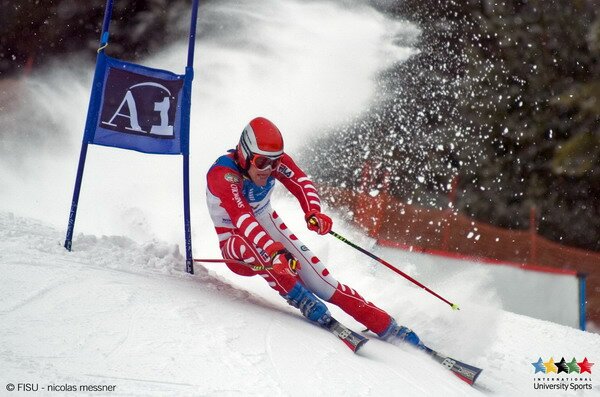 Aronne Pieruz (ITA) in full action during the 2nd run of the Men's Giant Slalom at the Casino Arena (Seefeld).