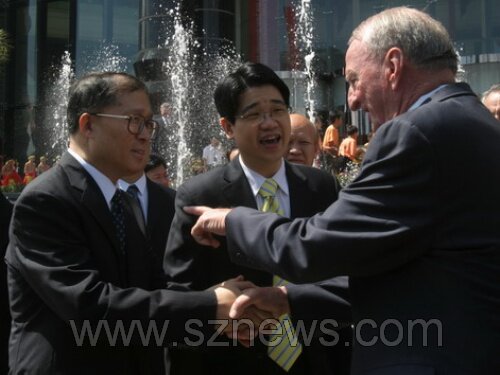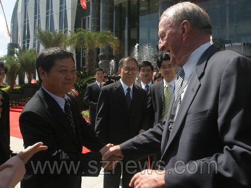 George E. Killian, President of the International University Sports Federation (FISU) and Li Hongzhong,Secretary of Shenzhen Municipal Committee of the CPC shake hands.