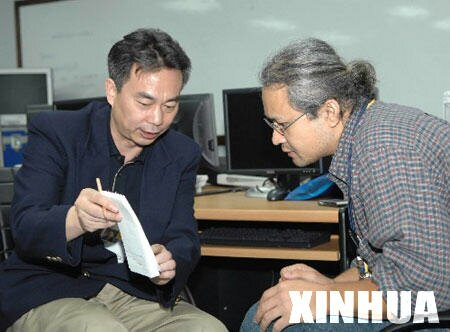 Peng Shujie (L), deputy editor-in-chief of Xinhua News Agency, who is also director of Xinhua reporting squad for the 24th Universiade, is interviewed by a TV media of Thailand at the main press center (MPC) of the 24th Universiade in Bangkok, Thailand, Aug. 4, 2007. The Chinese media arrived in Bangkok in force on Friday night, Aug. 3, 2007. (Xinhua Photo/Wu Wei)