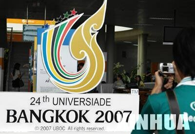 A volunteer takes photo of the emblem of the 24th Universiade at the main press center (MPC) of the 24th Universiade in Bangkok, capital of Thailand, Aug. 4, 2007. The 24th Universiade Bangkok 2007 will be held from Aug. 8 to 18. (Xinhua/Xu Jiajun)