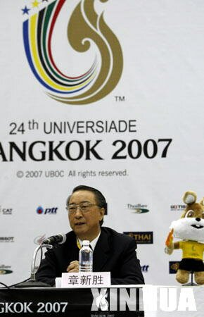 Zhang Xinsheng, deputy Education Minister and chairman of Federation of University Sports of China, who is also reappointed as the vice president of International University Sports Federation (FISU), speaks at a press conference of Chinese delegation to the 24th Universiade Bangkok 2007 at the main press center (MPC) in Bangkok, capital of Thailand, Aug. 7, 2007.(Xinhua Photo)