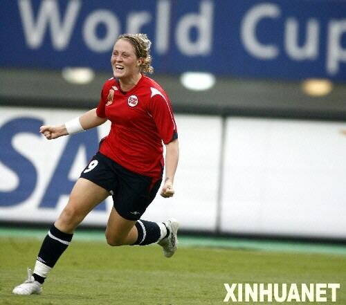 Norway's Isabell Herlovsen jubilates after scoring a goal against China during the quarter-final at the 2007 FIFA Women's World Cup in Wuhan, capital of central China's Hubei Province, Sept. 23, 2007. Norway was qualified for the semi after winning the match 1-0. (Xinhua Photo)