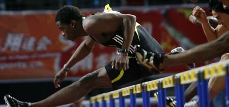 Dayron Robles of Cuba competes in the men's 110m hurdles during the Golden Grand Prix in Shanghai, Sept. 28, 2007. Robles won with a time of 13.01 seconds. (Xinhua/Liao Yujie)