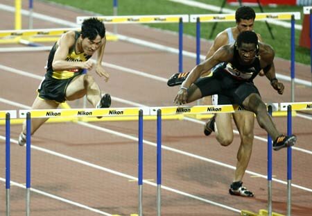 Dayron Robles (Front) of Cuba competes in the men's 110m hurdles during the Golden Grand Prix in Shanghai, Sept. 28, 2007. (Xinhua Photo)