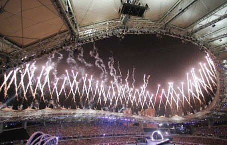 Fireworks explode in the sky above the stadium during the opening ceremony for the 2007 Special Olympics at Shanghai Stadium in Shanghai, east China on Oct. 2, 2007. The Shanghai Special Olympics Summer Games was staged here Tuesday. (Xinhua Photo)
