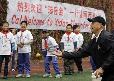 Young Chinese boys react as U.S. baseball legend Cal Ripken Jr. (R) throws a ball during a baseball clinic at Xidan Elementary School in Beijing Oct. 30, 2007. Ripken is on a nine-day visit to China, his first as an American Public Diplomacy Envoy for the U.S. Department of State, during which he will conduct a series of baseball clinics for local children and coaches.(Xinhua/Reuters Photo)