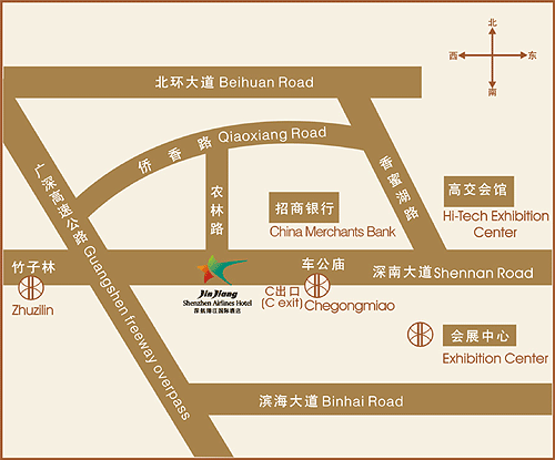 The hotel is located on Shennan Road in the Futian District of Shenzhen. It lies in the western section of the city commercial center and east of the Guangshen freeway overpass. The new subway station is conveniently located on the east side of the hotel, which is also in close proximity to the Hi-Tech Fair Center, the Tian'an High-Tech Zone, OCT Leisure Center and the Honey Lake District. Bao'an International Airport is a quick 30 minutes away and the Luohu Train Station an easy 15 minutes from the hotel. A convenient transport network makes your journey fast and reliable.