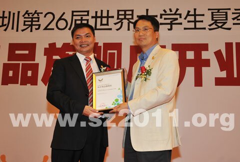 | 大运会执行局副局长赵广华(右)颁发特许商品证书 |