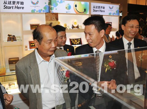 | 大运会执委会副主席、执行局局长梁道行(左)视察特许商品 |