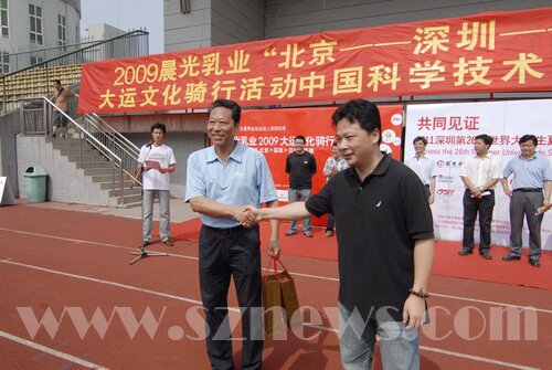 大运会官方网讯(特派记者 谢礼致)经过两天的挺进大别山之后,大运文化骑行队终于抵达中国科学技术的最高学府——中国科学技术大学,6月10日上午,晨光乳业“北京―深圳―贝尔格莱德”2009大运文化骑行队,在中国科学技术大学运动场举行简单而隆重的安徽站发车仪式。两百名科技大自行车爱好者身着统一的服装,带着自行车,来共同见证这一时刻。