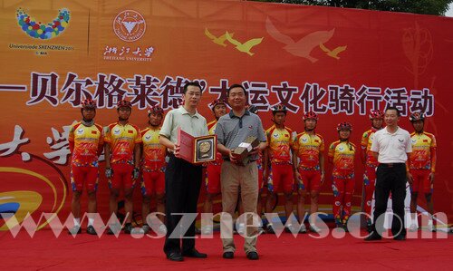 大运执行局信息技术部负责人卢新根在发言中感谢浙江大学对活动的大力支持,并热烈邀请浙大全体师生参加2011深圳大运会。大运文化骑行志愿者与浙江大学师生们还举行了互换会旗和校旗的仪式,届时这些互赠的校旗将在2011年大运会期间在深圳展出和升起。