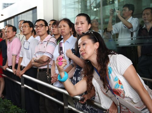 下午5点40分,市民中心B区贵宾通道铺就百米红毯,通道两侧挤满了早早等候的大学生、志愿者和市民代表,大家怀着企盼和激动的心情,共同迎接大运会会旗抵达深圳的历史时刻。当王荣和深圳大运会执行局局长梁道行率领刚从贝尔格莱德返回深圳的代表团全体成员走上红毯,全场响起热烈的掌声。随后,刘玉浦、王荣分别高高舞动大运会会旗进行了展示。