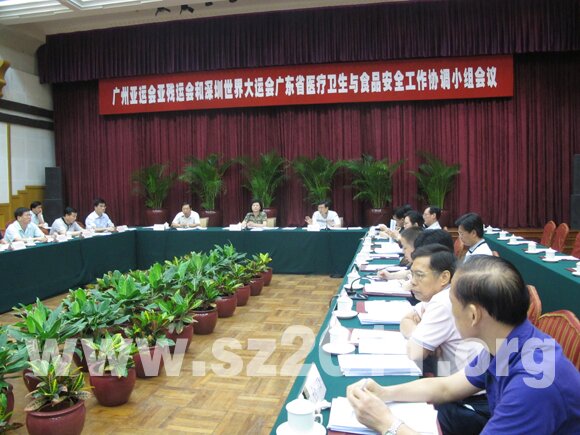 大运官网讯 5月27日上午,广州亚运会、亚残运会和深圳世界大运会(以下简称“三会”)医疗卫生与食品安全工作协调小组会议在广州召开。会议听取了广州、深圳,省卫生厅、农业厅、海洋渔业局等有关医疗卫生与食品安全保障工作情况汇报,研究部署下一步各项工作。广东省副省长、省“三会”医疗卫生与食品安全工作协调小组组长雷于蓝出席会议并讲话,省政府副秘书长李捍东主持会议。省政协副主席、省卫生厅厅长、省“三会”医疗卫生与食品安全工作协调小组副组长姚志彬出席会议。