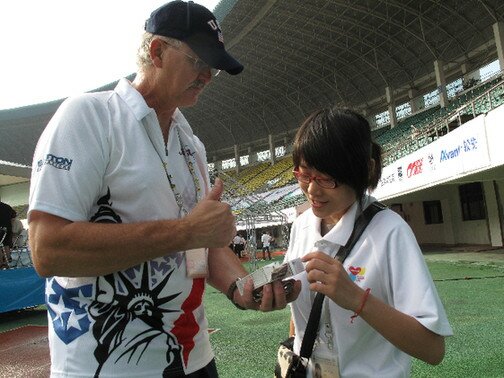结束连续数日的阴雨天气后,今天的鹏城重新被热浪包裹。对于不少刚从国外抵深的外国代表团来说,要在短时间内适应湿热的气候并非一件容易的事情。这不,24日一大早,美国的一名官员便为中暑的队员四处寻找解暑药。一名来自深圳高职院的志愿者此时挺身而出,一溜小跑找到了赛事组委会的医务中心,并从一堆印满了英文标签的西药中迅速找到了解暑药,为这名美国官员一解燃眉之急。事后,美国代表团官员情不自禁地给志愿者竖起了大拇指,并主动将自己珍藏多时的纪念徽章送给了这名志愿者。