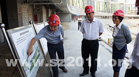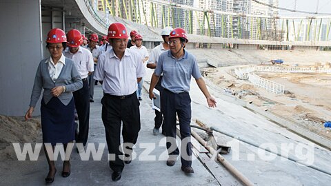 大运会执委会副主席、执行局局长梁道行(中)在宝安体育场现场调研