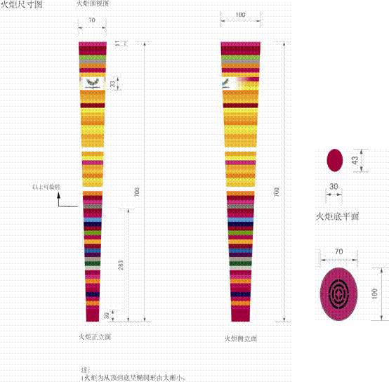火炬的创意亮点:椭圆形、多彩切片可以任意旋转出各种造型,是一支可与火炬手互动、造型百变的火炬。每一位火炬手都可以根据自己的想象,调节出自己喜爱的火炬形状。这就意味着:每一位火炬手和他的火炬都是独一无二的。